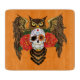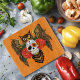 Eine braune, große Hornkeule mit einem Tag, den toten Zuckerschädel und rote Rosen in einem orangefarbenen Hintergrund