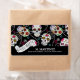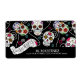 Ein farbenfrohes Design für den 'Tag der Toten', mit einer Vielfalt dekorativer Zuckerschädel mit Blume und wirlem Akzent auf einem optionalen schwarzen Hintergrund. Das weiße Banner mit dem Text "Feliz Dia de los Muertos" ist optional und kann bei Bedarf gelöscht werden. Suchen Sie ID725 um andere Farbauswahl und Produkte mit diesem lustigen Muster zu sehen.