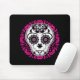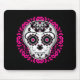 Ein hübscher, von Hand gezogener Zuckerschädel in Weiß, Fuchsia und Schwarz mit vielen eleganten Kaleidoskop-Akzenten.