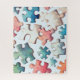 Entdecken Sie ein spielerisches Design mit zufälligen Formen, Größen und Farben von Puzzleteilen, die in einem Aquarell-Stil mit einem hellblauen Hintergrund zerstreut sind. Lassen Sie sich von diesem zauberhaften Puzzle verzaubern.