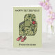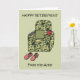 Ein niedlicher Camouflage gemusterter Sessel mit Hausschuhen, TV-Remote-Kontrolle und Tasse-Set vor einem khaki-farbenen Hintergrund. Das Bild wird durch die Worte 'Happy pension from the Army' begleitet.