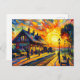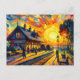 Das Bild zeigt ein lebhaftes und farbenfrohes Bild eines Bahnhofs bei einem scheinbaren Sonnenuntergang oder Sonnenaufgang. Der Himmel ist voll von wirbelnden Mustern in Gelb, Orange, Blau und Rot, die auf die Bahngleise und die Bahnsteig-Plattform reflektieren. Das Gebäude des Bahnhofs trägt den Titel "Bahnhoft", und auf dem Bahnsteig gibt es mehrere Gestalten, einige stehend und einige zu Fuß. Bäume reihen sich auf einer Seite der Spuren ab und biegen leicht, als ob sie vom Wind geblasen würden. Der Stil erinnert an Vincent van Gogh's postimpressionistische Arbeiten, mit kühnen Farben und dynamischen Pinselstrichen, die ein Gefühl der Bewegung in der ganzen Szene schaffen.