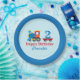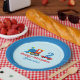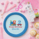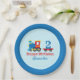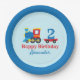 Bringen Sie Ihre Geburtstagsparty mit personalisierten Tellern auf die nächste Stufe! Dieser blaue Teller mit benutzerdefiniertem Papier verfügt über einen niedlichen Motor, der eine Pflege mit einer Nummer darauf zieht. Ändern Sie die Zahl, um sie dem Alter des Geburtstagskinders anzupassen. Auf dem Teller steht "Happy Birthday" und hat auch einen Platz für den Namen des Kindes. Alle Texte können mit Wörtern, Schriftart und Farben angepasst oder gelöscht werden.