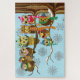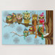 Eine Gruppe junger niedlicher Eulen sind im Winter draußen und hängen an einigen Zweigen zusammen. Schneeflocken fallen um sie herum.
