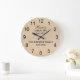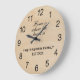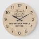 Eine personalisierte Uhr, die das Nachname-Set der Familie vor einem Hintergrund aus hellem Holz mit dem Text "Zuhause Is where the Heart is" (ist, wo das Herz ist) zeigt. Diese benutzerdefinierte Uhr ist ein großartiges Geschenk für jeden Anlass. Erhältlich in drei Größen.