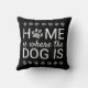 Dieses niedliche und lustige grafische Kissen mit den Begriffen "Zuhause ist, wo der Hund ist" in der modernen Schrifttyp-Schrift, inklusive einem silbergrauen Silberopfdruck für das "o" in "Zuhause" und einem Fußpflasterdruck auf schwarzem Hintergrund, macht es gemütlich.