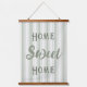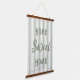 Diese Wand hängt mit einem Hintergrund von Bauernhaus tickt Streifen in Salbei grün. Der angezeigte Text sagt "Zuhause Sweet Zuhause", was Sie für ein sehr personalisiertes Aussehen den Schriftart, die Farben und den Text ändern können.