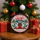 Dies ist ein spielerisches, kreisförmig-gerahmtes Grafikdesign mit einem humorvollen Weihnachtsthema. Das zentrale Bild zeigt die gestreiften Beine und die roten, lockengezackten Stiefel eines schelftigen Elfs, das Set vor einem hellblauen Hintergrund mit Schneeflocken. Über den Beinen der Elfen erklärt ein Banner stolz "ZUHAUSE OF ONE NAUGHTY" in fett gedruckten, roten Buchstaben, mit "ELF" am unteren Ende des Designs. Die ganze Szene ist umgeben von festlichen heiligen, roten Beeren und Bonbons, die alle in einem rot-weiß gestreiften runden Rahmen eingeschlossen sind. Die Ästhetik wirkt insgesamt fröhlich, skurril und fügt der Feriendekoration eine Touch Spaß hinzu.