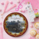Papier Teller mit einem altmodischen Zug mit einem schneebedeckten Berg im Hintergrund Zuhause für Weihnachten.