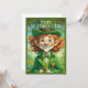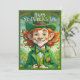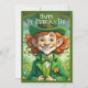 🍀 Ein junges Mädchen, das als Kobold verkleidet ist, mit Aufregung und einem wunderschön umhüllten goldenen Geschenk. Sie trägt ein lebendiges, grünes Outfit mit einem Hut, der mit Kleeblättern, einer Bogen-Krawatte und goldenen Knöpfen geschmückt ist. Der Hintergrund erfasst eine festliche Stadtszene mit Konfetti in der Luft und verstärkt den fröhlichen Geist des St. Patrick’s Day. Das Bild strahlt Glück, Glück und Feier aus. ✨