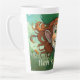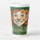 Ein fröhliches junges Mädchen, gekleidet als Koboldtran mit Aufregung, mit einem wunderschön verpackten goldenen Geschenk. Sie trägt ein lebendiges, grünes Outfit mit einem Hut, der mit Kleeblättern, einer Bogen-Krawatte und goldenen Knöpfen geschmückt ist. Der Hintergrund erfasst eine festliche Stadtszene mit Konfetti in der Luft und verstärkt den fröhlichen Geist des St. Patrick’s Day. Das Bild strahlt Glück, Glück und Feiern aus.