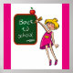 MÄDCHEN SCHREIBEN "WIEDER IN DIE SCHULE" AUF DEM CHALKBOARD, MIT EINEM APFEL FÜR DEN LEHRER