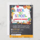 Chalkboard Back to School Supply Drive Fundraiser Flyer mit einem Kreidebrett Hintergrund, Kreidestreifen und farbenfrohen Schulmaterialien