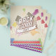 Weiße Typografie über eine Collage von Grafiken, um: Foto-Formen; bunte Buttone, Rahmen, Etiketten, Bögen, Blume und Bindeklemme.