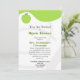 Eine Einladung mit einem grünen und weißen Farbschema. Vorderseite zeigt grünes Design auf der Oberseite und Abbildung grüner Apfel oben links. Wirbelnder Hintergrund Personalisieren Sie sich mit dem Namen, der Klasse, dem Ort und dem Datum Ihres Rückens in die Schule Open House Orientierung. Die gegenüberliegende Seite ist grün.