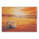Warme, goldene Farben zeigt an, dass die Abendssonne einstellt. Ohne irgendeine Singleperson gibt es nur eine riesige Muschel, die auf dem Strand verlassen wird, als ob er das Flüstern von Gezeiten hört. Einen langen Schatten werfend, unterstreicht die Muschel die Annäherung der Nacht und die Einsamkeit des Verstandes. Eine Welle von Gezeiten schlug das Ufer und brach die Ruhe und die Stille des ganzen Bildes. Zentrale des Bildes, ein Strahl des Sonnenlichts überschreiten durch Horizont, es vorschlagend wird beenden der Tag. Die sich hin- und herbewegenden haarigen Wolken geben diesem Bild eine alleinere Atmosphäre.