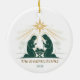 Bewundern Sie den Glauben und die Familie mit diesem eleganten, zweiseitigen Krippenschmuck mit einem strahlenden Stern und individualisierbarem Familiennamen und Jahr. Ein zeitloser Sake, um die wahre Bedeutung von Weihnachten in weichem Gold und tief grünen Tönen zu ehren.