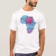 Dieser T - Shirt hat ein Bild von Afrika mit zwei Händen, die mit den Wörtern zusammengehalten werden, "zusammen, das wir unterscheiden".