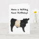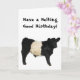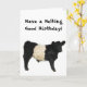 Ist hier ein hübscher umgeschnallter Galloway-Ochse, den Kalb mit einem lustigen eine zusammenhaltende gute Geburtstags-Mitteilung haben! Itts auch bereit, Ihren eigenen Bauernhofnamen, -mitteilung oder -namen hinzuzufügen! Diese seltenen schottischen beltie Kühe sind sanftmütig und robust.
