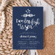 Unsere schicken Probe-Dinner-Einladungen an der Küste mit einem Küssen von Fischen in Weiß auf einem nautisch marineblauen Hintergrund. "Zwei weniger Fische im Meer" erscheint in der Schrift "Pinselkalligrafie", mit der Probe und den Details des Abendessens darunter. Die Einladungen werden in Aqua und Weiß in handgezeichnete Streifen umgewandelt.