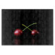 Zwei Kirschen - Zwei süße Kirschen (Prunus avium regina) in lebhaftem Grün und lila fotografiert vor einem schlichten schwarzen Hintergrund. © Alan Harman Fotografy 2013. Alle Rechte vorbehalten. www.alanharmanphotography.com 220518 Schneidebrett