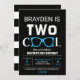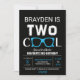 Sind Sie bereit für das coolste Party des Sommers? Feiern Sie stilvoll mit diesem modernen Zwei-Coolen 2. Geburtstag-Einladung, ideal für jedes Party im Sommer-Pool, das ein klassisches Schwarz-Weiß-Design mit einer auffälligen blauen Sonnenbrille bietet.