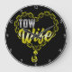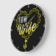 Diese Wanduhr ist eine liebevolle Hommage an die Ehefrau eines Lastwagenfahrers. Es hat eine Herzform aus goldenen Ketten, wobei in der Mitte die Aufschrift "TOW Ehefrau" in einem passenden gelben Schriftart hervorgehoben dargestellt wird. Die Uhr hat einen schwarzen Hintergrund und einen knusprigen weißen Rand, was einen auffallenden visuellen Kontrast schafft. Sie können die Farbe des Rahmens an jede gewünschte Farbe anpassen, indem Sie in das Designwerkzeug gehen.