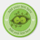 Zusammen in einer grünen Hülle sind zwei bezaubernde Erbsen. Jede Erbse hat Augenpunkte und ein fröhliches, freche Lächeln. Um die Hülle herum liegen Weinberge und grüne Blätter. Das Design ist Set in einem grünen Kreis. Um den Rand, oben und unten sind Vorlagen, um Ihren eigenen Text hinzuzufügen. Der Hintergrund ist grün mit winzigen Polka-Punkten.