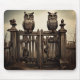 Es handelt sich um kunstvoll geschnitzte Uhskulpturen, die ein rustikales Holztor schmücken und einen bezaubernden Eingang schaffen. Die detaillierten Merkmale der Eule und der durchdringende Blick verleihen der Szene ein mystisches und charmantes Element
