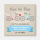 Fahrradhochzeiten sind ein lustiger, neuer Trend bei thematischen Hochzeiten. Auf diesem Imitat Leinenhintergrund speichern Sie den Datums-Magneten, zwei Fahrräder treffen sich und schaffen ein kleines Herz, um das verheiratete Paar zu symbolisieren. Das Fahrrad der Braut hat einen Hochzeitsschleier auf dem Sitz und einen Strauß im Korb. Das Fahrrad des Bräutigams hat eine ungebundene Bugs-Krawatte, die um die Lenker herum gewickelt ist. Die Namen der Paare stehen in einem himmelblauen Banner unten. Ideal für ein Fahrradtheater oder eine Hochzeit im Freien. Erhältlich in alternativen Farben mit Tandembike Option.com.