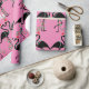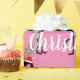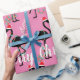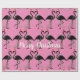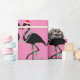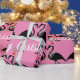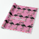 Zwei Flamingos begegnen sich mit Weihnachtsmannmützen auf den Köpfen und Weihnachtsleuchten, die um ihren Hals gezogen sind.