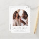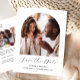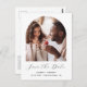 Diese einfache, minimalistische boho Save the Date Postkarte zeigt ein bogenförmiges Foto über den Worten "Save the Date" in elegantem schwarzen Handschrift, gefolgt von den Namen der Ehepaare, Hochzeitstag und Stadt in sans serif Schriftart auf weißem Hintergrund. Fügen Sie auf der Rückseite ein zweites, rechteckiges, horizontales Foto hinzu, zusammen mit Ihrer Rücksendeadresse und einem zusätzlichen Text mit weiteren Informationen oder Details.