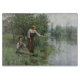 Zwei Frauen fischen auf dem Gras am Fluss Schneidebrett