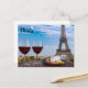 Zwei Gläser Rotwein mit Snacks mit Blick auf Paris und Eiffelturm. Glas Rotwein mit verschiedenen Snacks - Teller mit Schinken, geschnitten, blauer Käse. Ein paar romantische Feste. Cafe mit Aussicht.