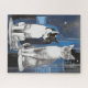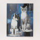Puzzle in einer Abbildung zweier Katzen sitzen anmutig vor einem tiefblauen, abstrakten Hintergrund. Die realistischen Pelztexturen mit kühnen Linien und geometrischen Elementen schaffen eine moderne surreale Atmosphäre. Ihre ausdrucksstarken gelben Augen kontrastieren auffallend mit der coolen Umgebung.
