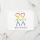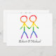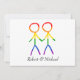 Diese Save the Date Karte zeichnet sich durch ein schönes und einfaches Design aus, um Ihre kommende Hochzeit bekannt zu geben. Die Grafik zeigt zwei Männer, in Form von eleganten Strichmännchen, die Hände halten. Die Figuren sind in einem wunderschönen Regenbogen gefärbt und symbolisieren Liebe und Diversity. Diese Karte ist ein wunderbarer Weg, um eine kohärente und sinnvolle Touch in Ihre Schreibwaren zu bringen und gleichzeitig den Gästen eine klare und elegante Möglichkeit zu geben, ihre Kalender zu markieren.