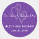 Zwei Herzen werden eine Gastgeschenk Hochzeit Aufkleber in lila. Passen Sie Ihre Hochzeitsfarben und Ihren Text an. Fügen Sie zusätzlichen Text hinzu, wenn Sie möchten. Weitere Designs unter whitewhimsicalweddings.com und whitewhimsicalweddings.blogspot.com