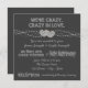 Rustikale Landtafelhochzeits-Einladungsschwarzweiss-schablone. Diese weissen Hochzeitseinladungen haben zwei verflochtene Herzen und "wir sind verrückt. verrückt in der Liebe." Proklamation sowie der traditionelle "heilige Ehestand". Diese einfache und traditionelle Tafelhochzeitseinladung fügt eine Touch der altmodischen Gesundheit hinzu!