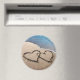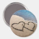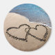 Schönes, originelles Foto von zwei Herzen geschrieben im Sand entlang des blauen Ozeanwassers, um Liebe und Romantik. Ein tolles Konzept für kommende Hochzeiten im Sommer.