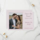 Das Design zeigt das von Ihnen bereitgestellte Foto als Hauptdesign vor einem hellrosa Hintergrund und umrahmt von einem eleganten, staubrosafarbenen Rand. Rechts neben dem Foto wird Ihr Text mit Überschrift, Namen und Stadt & Bundesstaat der Hochzeit in einer passenden staubrosafarbenen Schrift angezeigt.