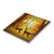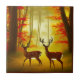 Keramik-Kachel in einer Abbildung von zwei Hirschen, einem Buchsen und einem Tor, vor einem Hintergrund von Herbstwäldern in Brauntönen, Gelb und Rostorange