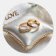 Zwei Hochzeitsringe auf einer Liebe mit weißem Kissen auf Goldaufklebern