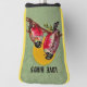 Dieses individuelle Cover für Ihre Putters ist grün mit zwei hübschen Liebesvögeln, die rosa und schwarz sind und auf einem Ast sitzen vor einer gelben Sonne mit dem Text Love Birds.