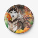 Zwei Husky Hunde, Gartenkarren und Kürbis Pappteller