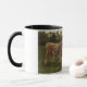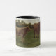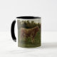 Dieses Design zeigt ein Gemälde von Rosa Bonheur (1822-1899), einer französischen Künstlerin, die am besten als Tiermalerin bekannt war. Es zeigt zwei Kühe, die im Feld eines Bauern stehend sind. Eine der Kühe hat eine hellbraune Haut mit furiosen Haaren, die andere Kuh hat eine dunkelbraune Haut. Beide Kühe haben Hörner auf dem Kopf.