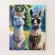 Zwei Lamas stehen nebeneinander, mit bunten Kopfbedeckungen geschmückt, Set gegen eine malerische Berglandschaft. Große Bäume und ein klarer Himmel umrahmen die pulsierende Szene, die eine ruhige Außenumgebung einnimmt.