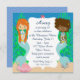 Die wunderschöne Party Einladung unter dem Meeresgeburtstag besteht aus zwei Meerjungfrauen, einer ethnischen Meerjungfrau mit dunkler Haut und dunklem Haar und einer Meerjungfrau mit rotem Haar in Braiden. Die Meerjungfrauen schwimmen im Ozean. Diese Mermaid-Einladung enthält einen eigenen Text, um ihn zu personalisieren. Einige Grafiken von AMBimages.