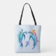 Abstrakte Abbildung mit zwei niedlichen blauen Delphinen mit orangefarbenen und lila Spritzern