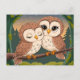 Zwei Eulen hissten auf einem Ast, ihre runden Augen breit und wachsam. Eine hat weiche braune Federn, die mit Weiß gesprenkelt sind, während die andere einen etwas dunkleren Absturz zeigt. Umgeben von dichten, grünen Bäumen sitzen sie nah zusammen und vermitteln ein Gefühl von Ruhe und Weisheit, während sie ihre Umgebung beobachten.