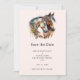Save the Date Karte mit einem Bild mit Pferdepaaren. Tragen dekorativer Headbands. Umgeben von Federn und Blättern.